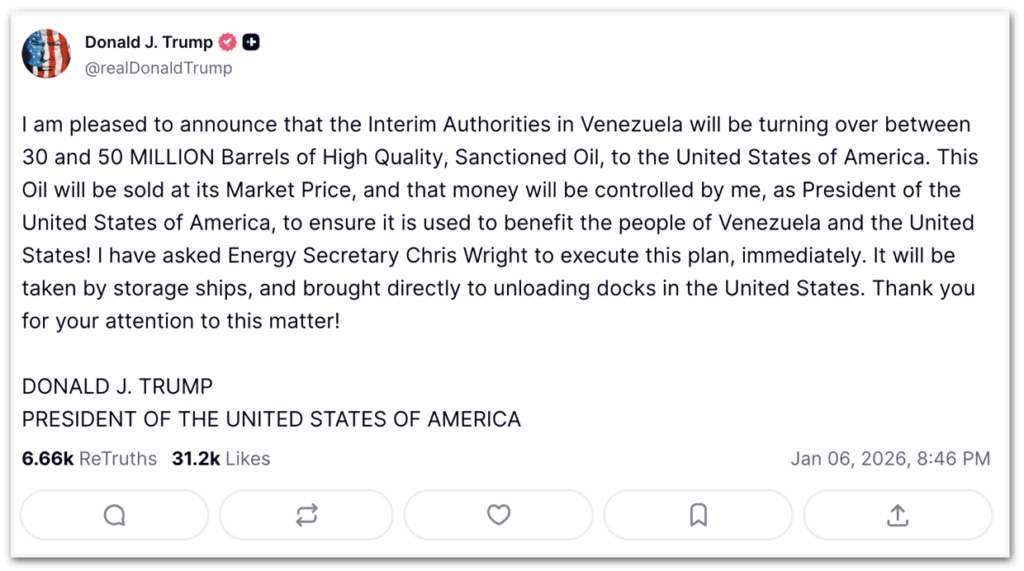 O ponto central do acordo não é apenas o volume, mas a custódia do dinheiro. Trump estabeleceu um mecanismo de controle direto: a receita gerada pela venda não passará por intermediários tradicionais. “Esse dinheiro será controlado por mim”, escreveu o presidente, justificando a medida como garantia de que os recursos beneficiarão as populações de ambos os países.